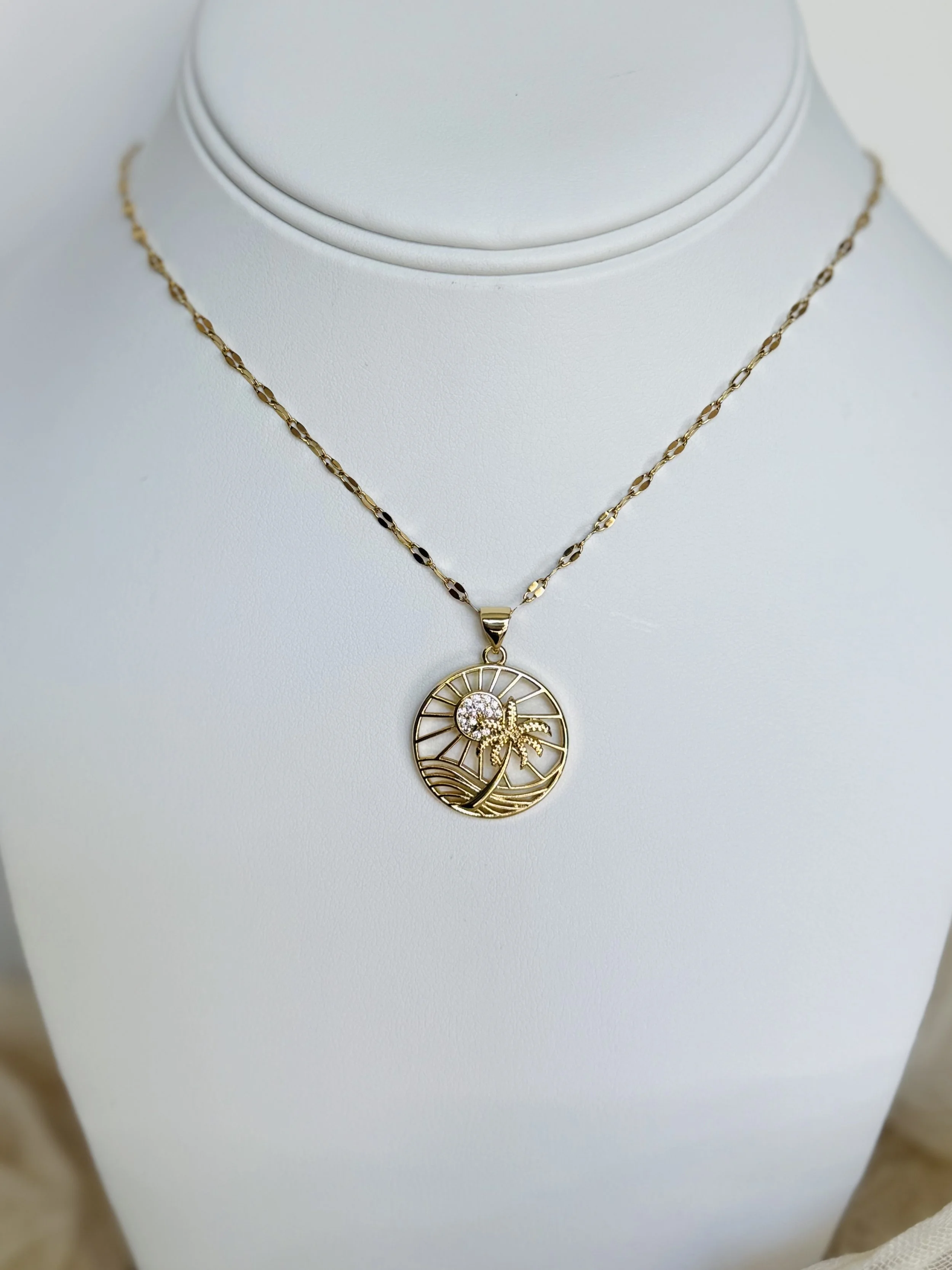 This stunning gold-filled pendant necklace features a beautiful design of sunny, palm tree skies with cubic zirconia accent. Inspired by the radiant sun and palm tree lined skies of Southern California. A timeless piece that makes a bold yet elegant statement.