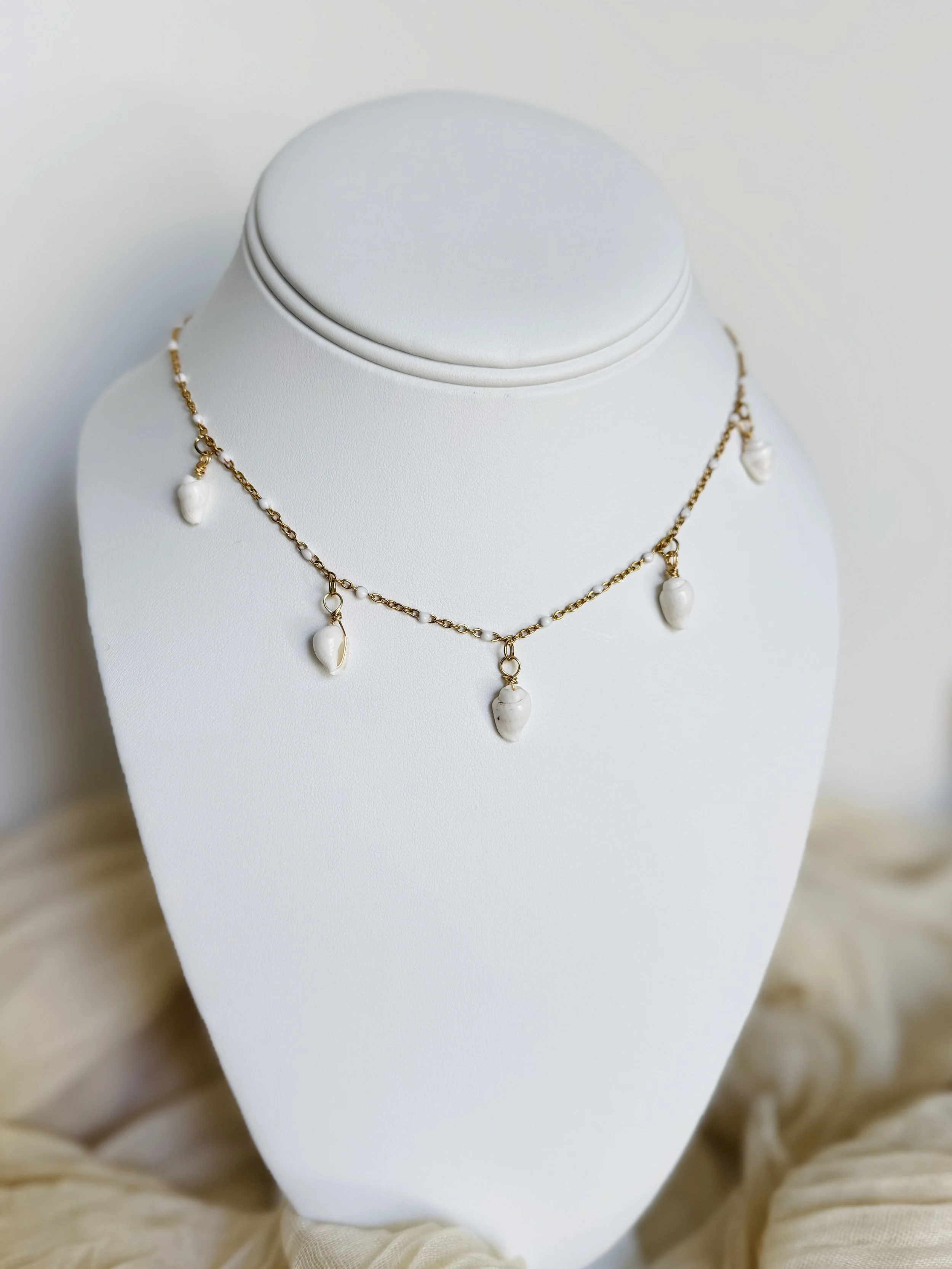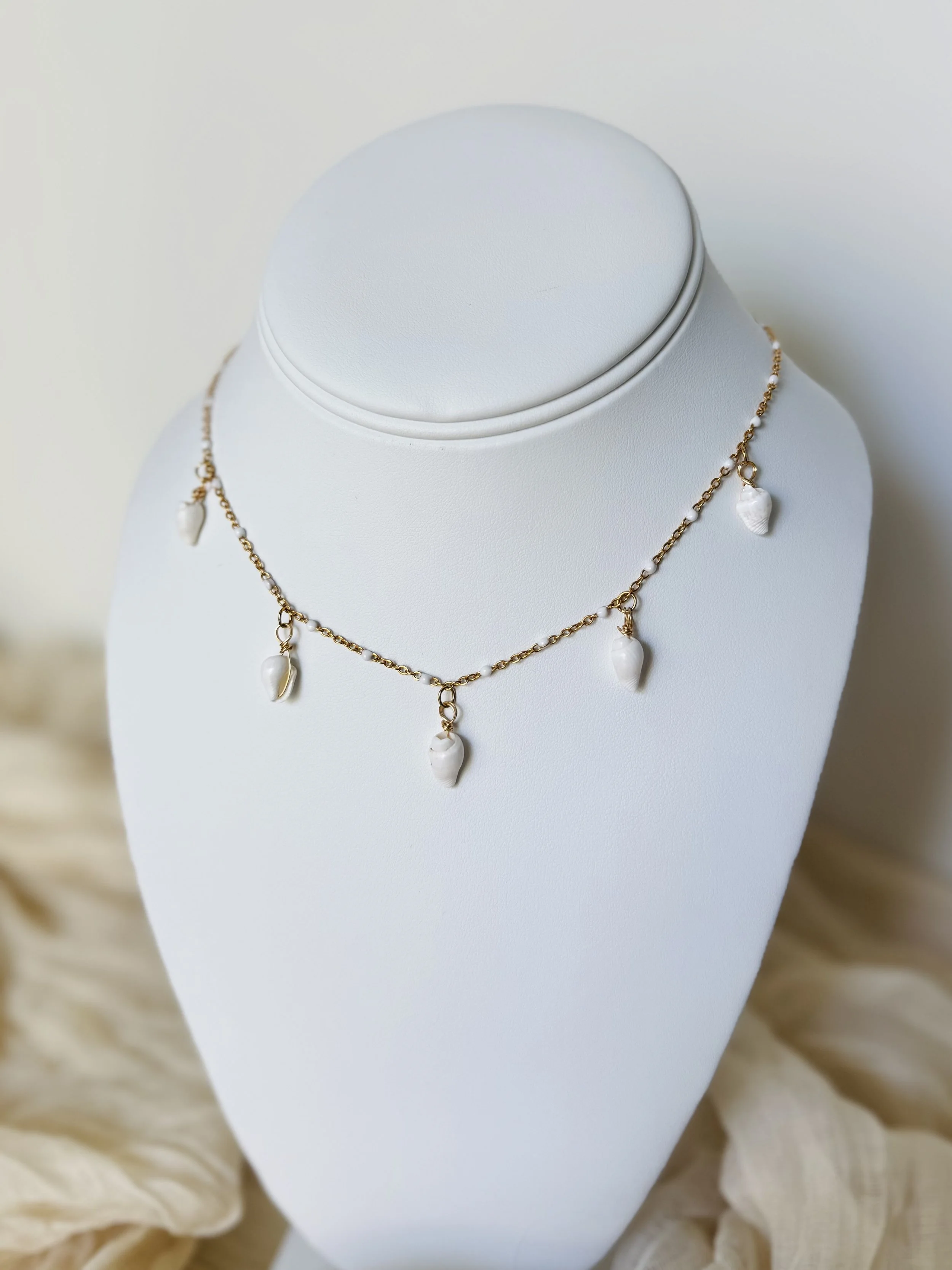 Tarnish-resistant and gold-plated stainless steel, this sea shell charm necklace is a one-of-a-kind piece handmade in Southern California. Inspired by the sunlit shores of Laguna Beach, each necklace features natural sea shells wrapped in durable, tarnish-resistant gold wire for a coastal touch you can treasure every day.